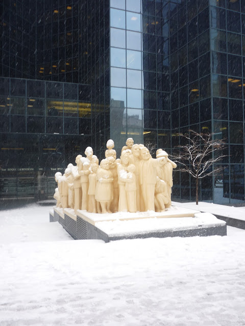 Vypadá to, že ani místní už se sněhem tak úplně nepočítali a přijeli na kole. (I když místní veřejná půjčovna kol Bixi ovšem začíná fungovat až 15., možná to mají přesně načasované do té doby to stihne roztát.) I ty sochy vypadají zmrzle a zaskočeně: